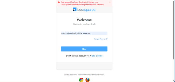 User not able to login as account is deactivated.