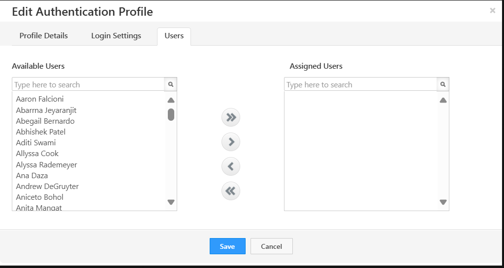 - If you wish to assign a user to this new authentication profile, you will need to manually add the user. This can be done by selecting the users from the list of available users or directly assigning them through the user management interface.