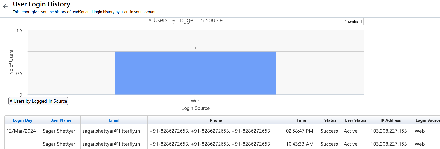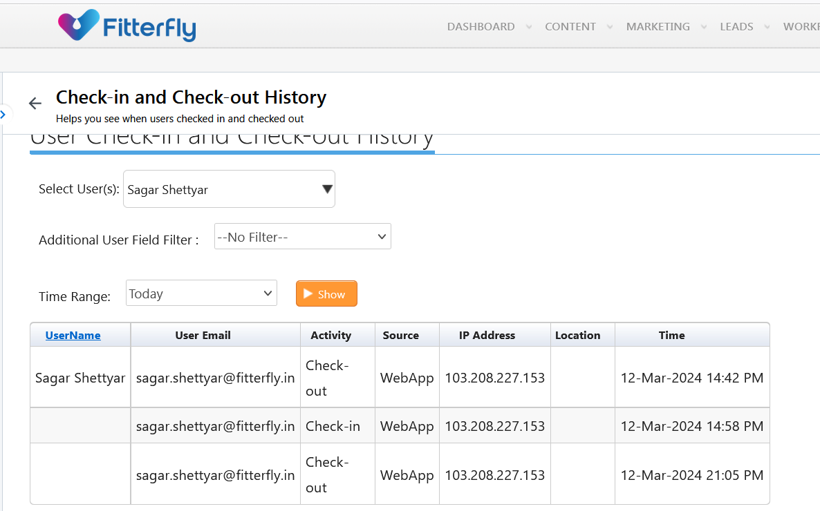 But for the user Sagar Shettyar (sagar.shettyar@fitterfly.in) the user was logged in at 12th March at 10:43 AM