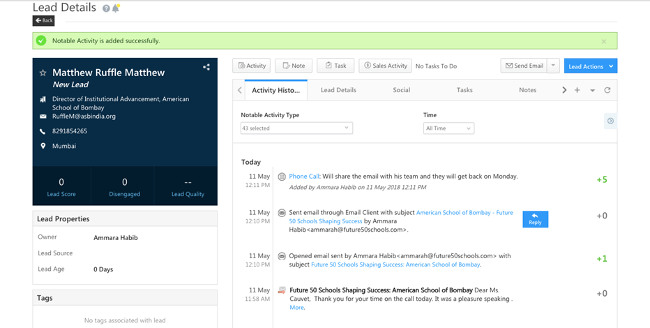 Upon performing an email sent  activity the name auto updates to Matthew Ruffle Matthew.
