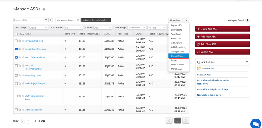 The process = Manage ASD’s>Advance Stage>Filter through dealer