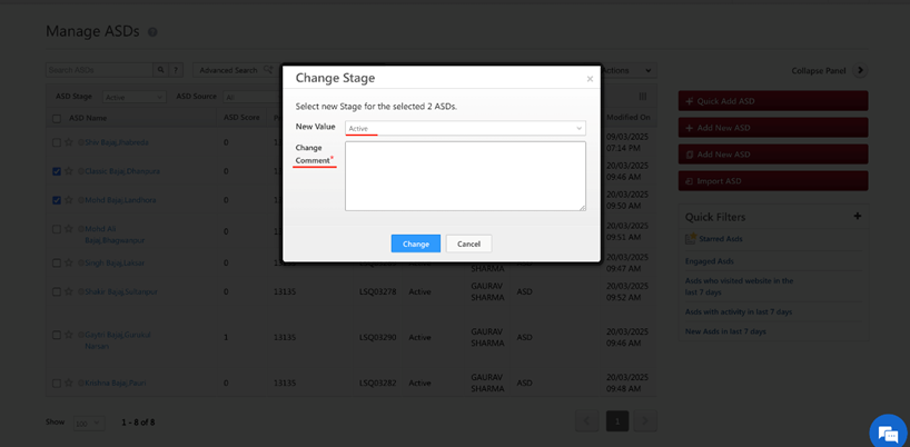 code>Select the ASD’s>Actions button>Change Stage>Add a comment (Asked