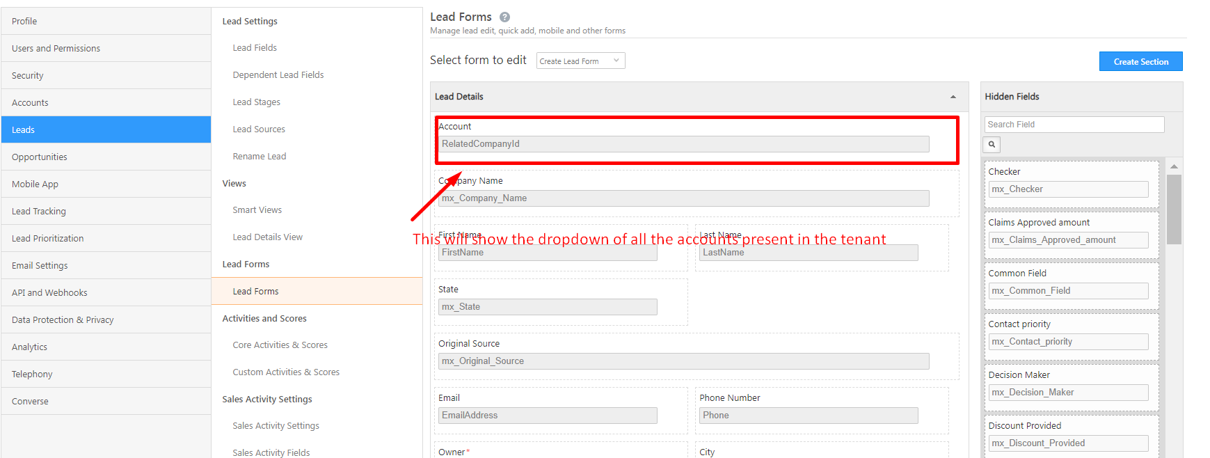 To associate a lead with an account, you can add the field “RelatedCompanyId” in the form “LeadForms”. This field is specific to the account module and will display as “Account” when filled.