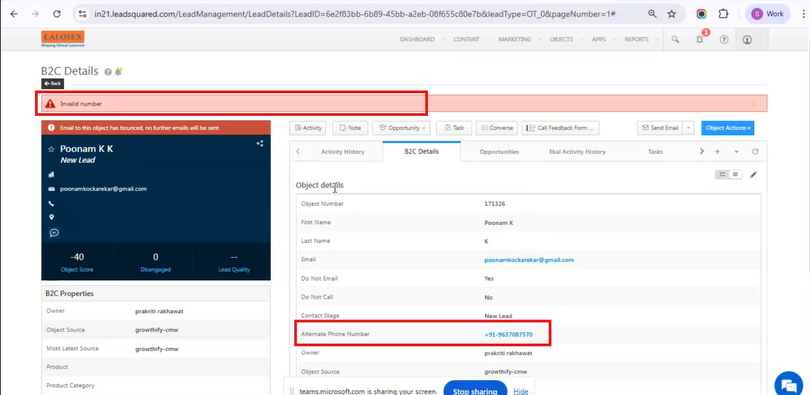 The Lead’s Phone field was mail-merged in the Click2Call URL. Due to this, the customer was unable to perform Click2Call using the Alternative Phone Number field, and it resulted in an Invalid Number error.