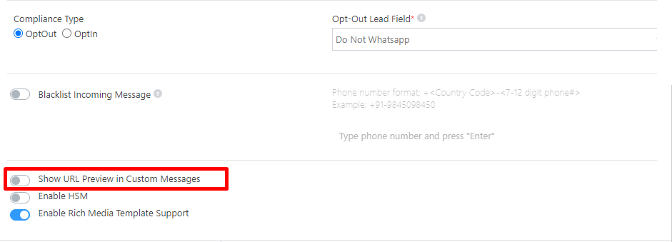 Solution: In the Advanced settings of the WhatsApp connector, there is an option called “Show URL Preview in Custom Messages”. This setting should be disabled because it is intended to show a preview if there is any media available in the WhatsApp message. However, when using a custom text message without any media, the API throws an error.