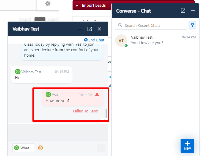 Issue: The customer is encountering an issue with sending WhatsApp messages through Converse. Approved templates go through successfully, but once the service window is active and customers respond to the template, subsequent messages fail to send, resulting in an error message that says “Failed to Send Message.”