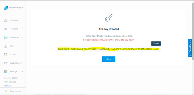 - Copy the API Key straight away as it is shown only for limited period of time due to security reasons. Click on Done