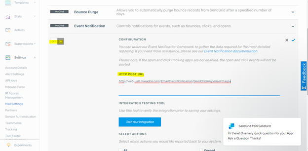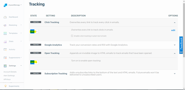 - Go to Settings -> Tracking -> Turn OFF, Click Tracking and Open Tracking (Skip this Step as instructed by Sendgrod team to capture the Open & Click Tracking)