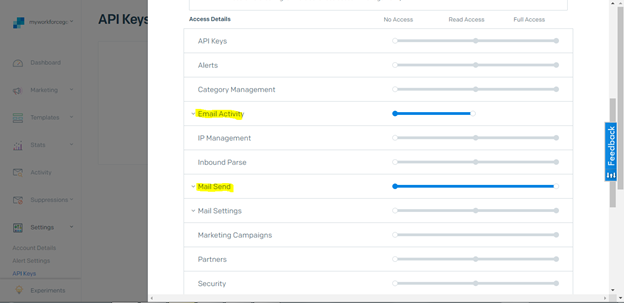 - Scroll Down, Give Read Access for Email Activity and Full Access for Mail Send.