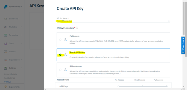 Under API key permissions Select Restricted Access.