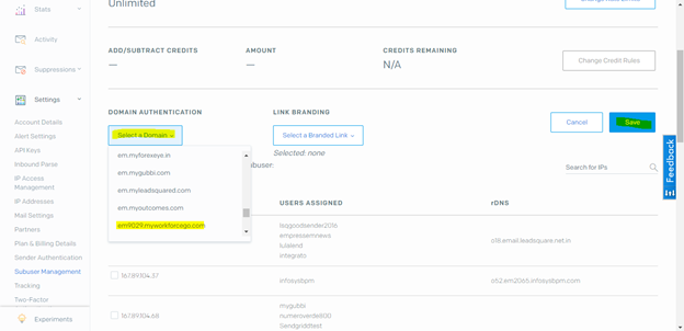 - Select the CNAME record from the Select a Domain drop down list. Click on Save and logout of Sendgrid.