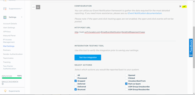Scroll down and Select Dropped, Bounced and MarkasSpam. Save the Event Notifications Settings