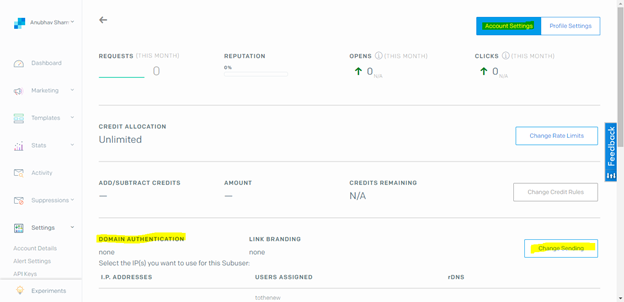 - We’ll be redirected to a different screen automatically after the above step. Make sure you are under Account Settings. Under Domain Authentication Click on Change Settings.