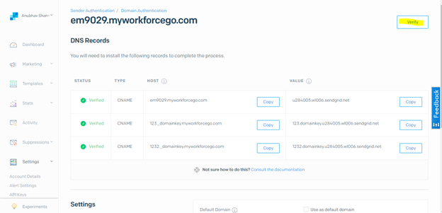 - Click on the Domain Name and click on Verify.