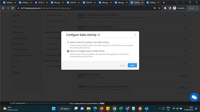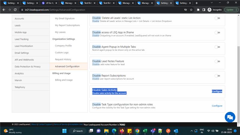 Please navigate to Profile —> Settings —> Advanced Configuration —> Disable Sales Activity.