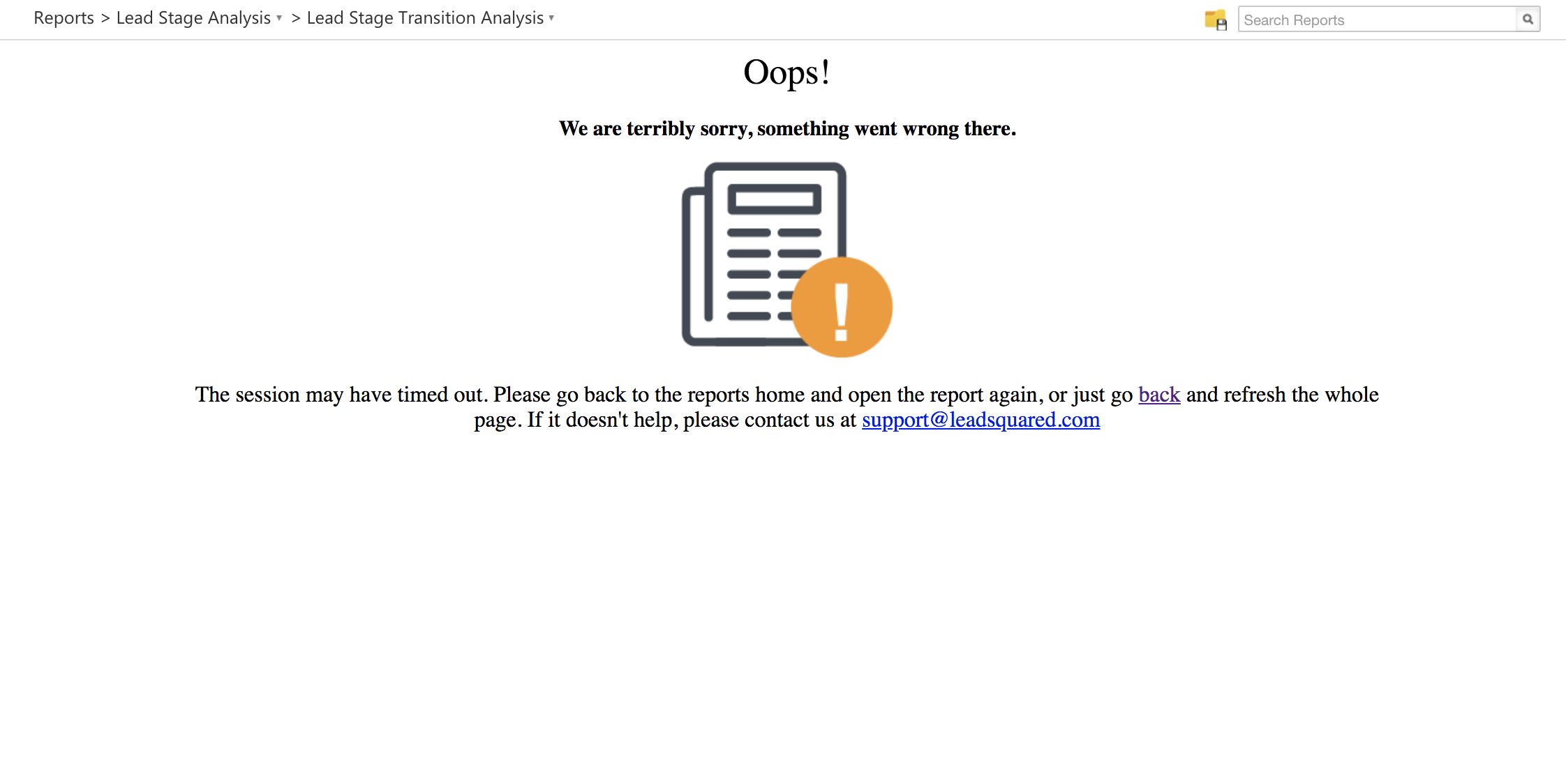 User is trying to access the report ‘Lead stage transition analysis’. On setting a filter as sales group, they receive the above mentioned error page.