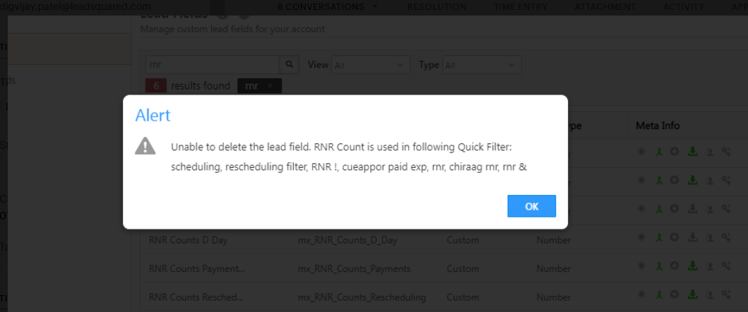 Issue: An error is thrown when a user tries to delete the lead field. Below error message is displayed when Admin tries to delete lead field.