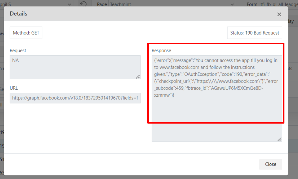 Leads not getting pushed to LSQ from FB. Getting unprocessed leads 190 Bad Request error.