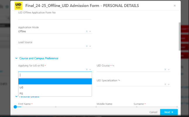 The same field (Applying for UG or PG) is not editable in the second process (Lead Details page).