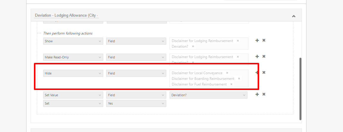 • When a rule evaluates to false, the configured action (Hide Field) is not applied.