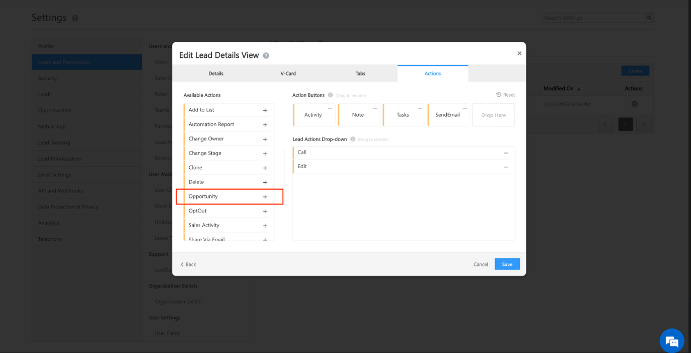 For the above case, Opportunity Button is not enabled through Lead Details View in the Settings.