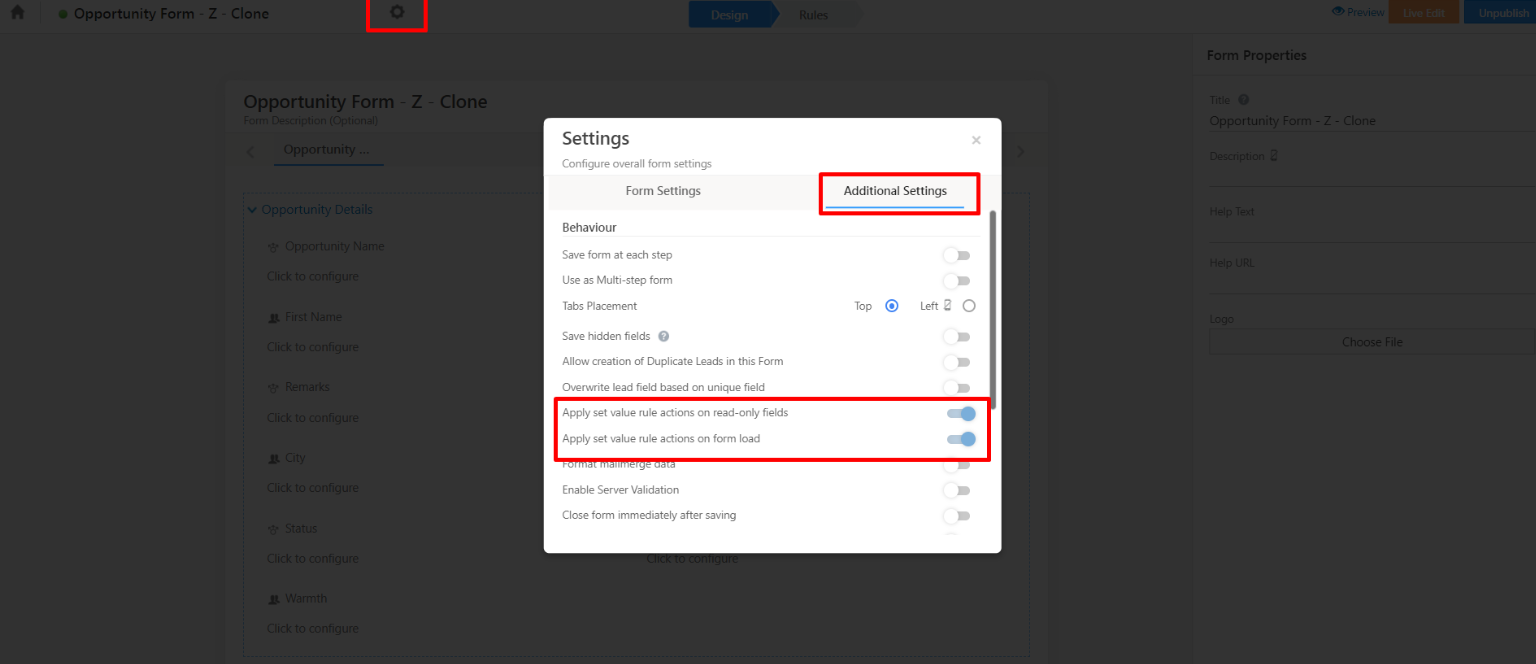 These settings are necessary for the read-only fields to get filled according to the defined rules and the rules to get applied on form load in the mobile app.