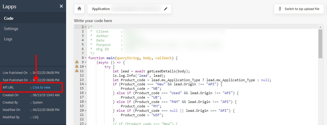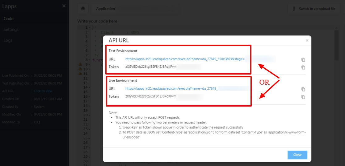 04. Copy the URL and associated Token of the environment on which LAPP has been published.