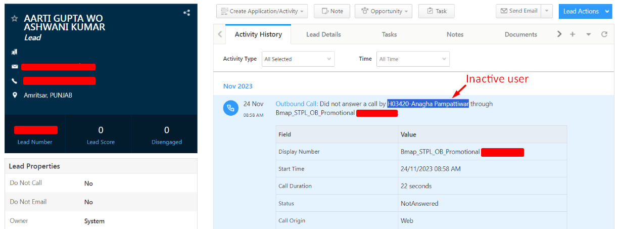 Description: Incorrect or inactive user details are posted in the MISSED call log activity in the activity history, even when no user data was posted in the payload (because of missed call).