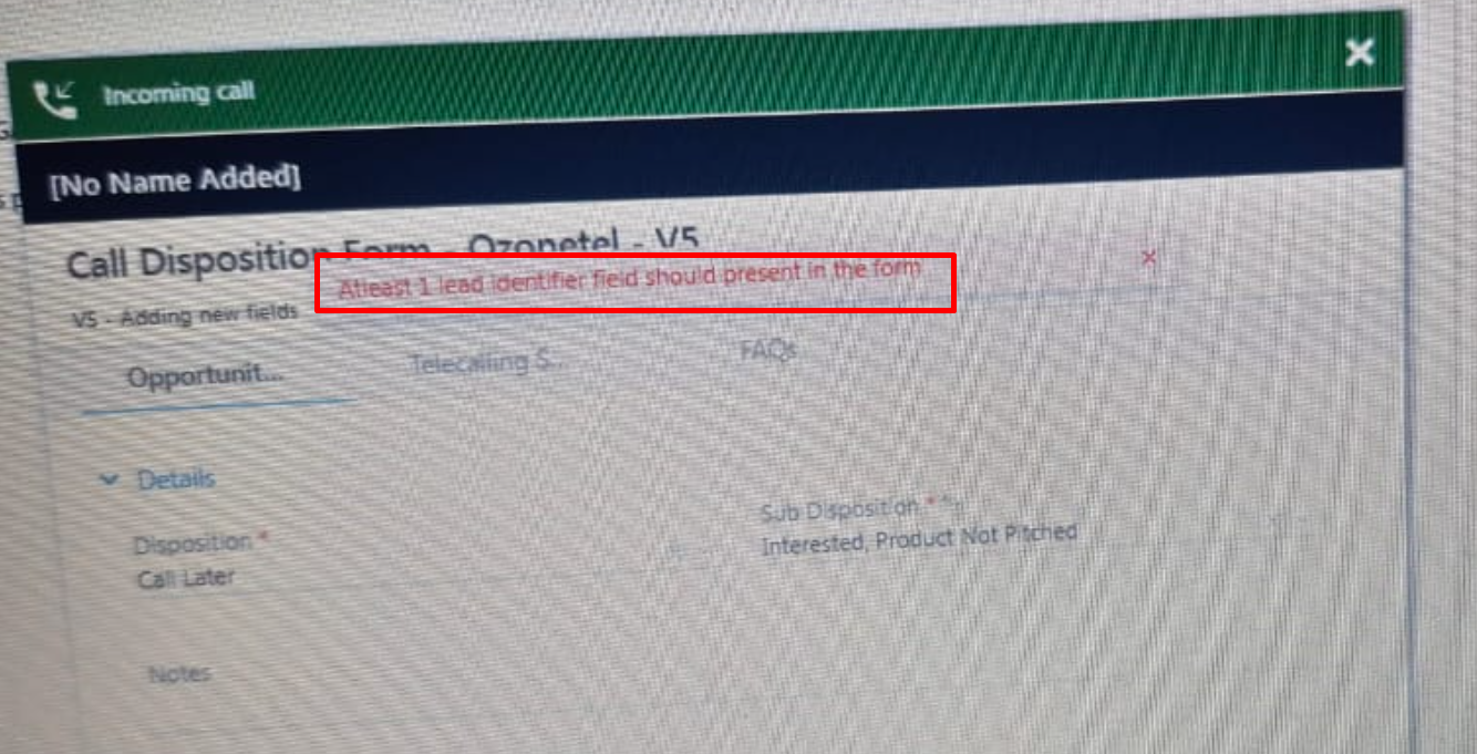Problem Statement – Customer is getting “At least one lead identifier field should be present in the form” error while saving opportunity pop up form.