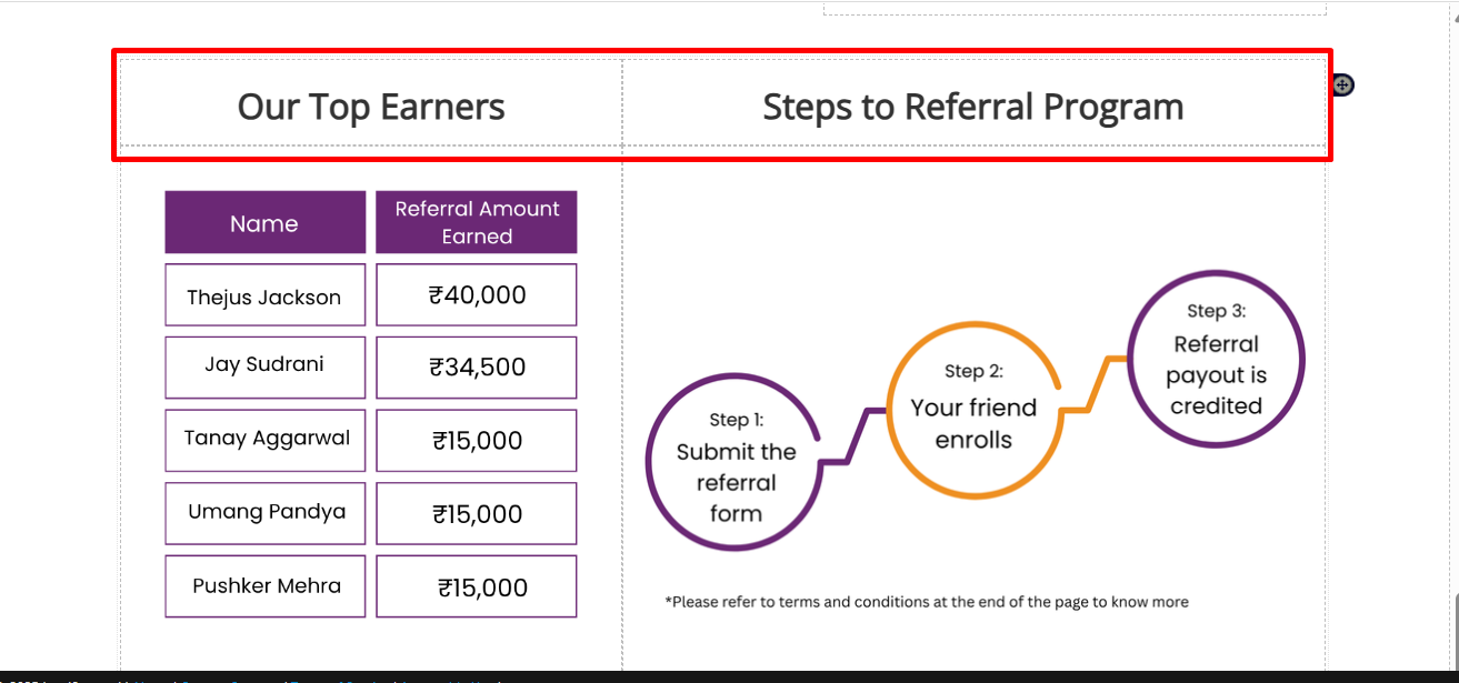 RCA – We see that from the first screenshot “Our Top Learners” and “Steps to referral programs” with two images below it, which are supposed to be separate heading for both of them respectively.