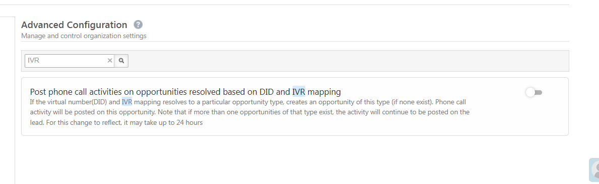 Issue: If a customer reports that the setting is enabled (see the setting name in the screenshot below for reference), why is the call log being posted to the Opportunity when both the IVR and DID numbers are not passed, instead of being posted to the Lead?