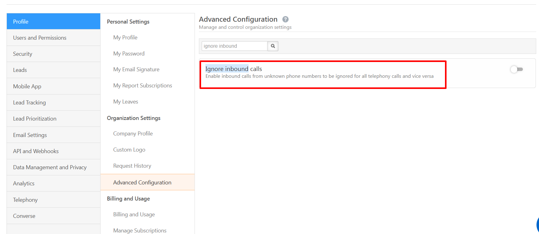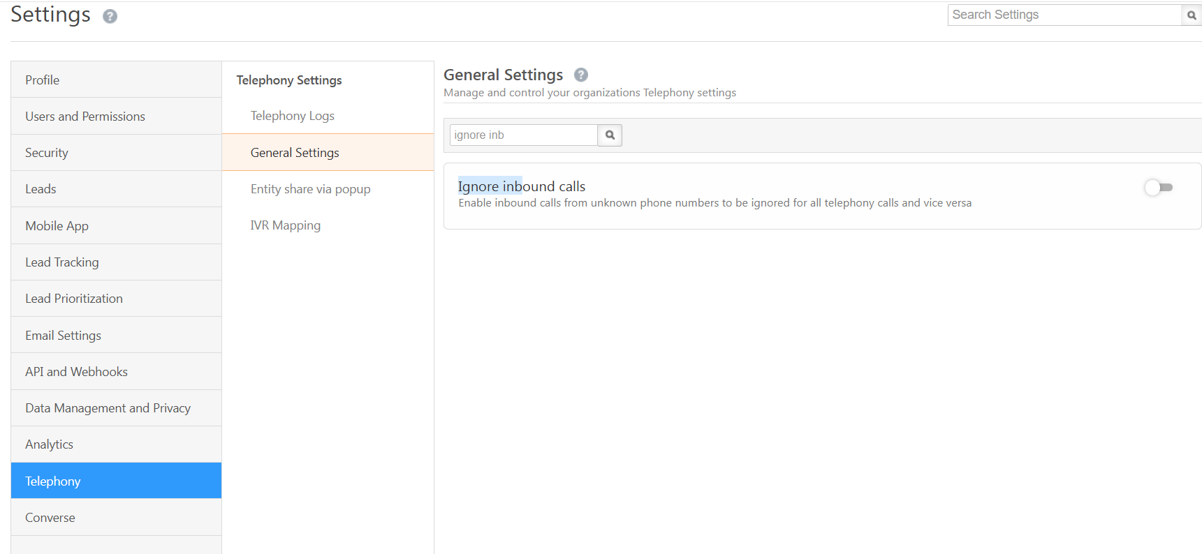 A setting called “Ignore Inbound Calls” which has restriction that prevents lead creation for inbound calls from unknown numbers.