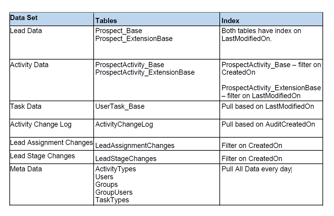 Lead and Activity data are in Prospect_Base, ProspectActivity_Base, and their extension tables (joined by ProspectId / ProspectActivityId).