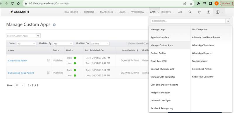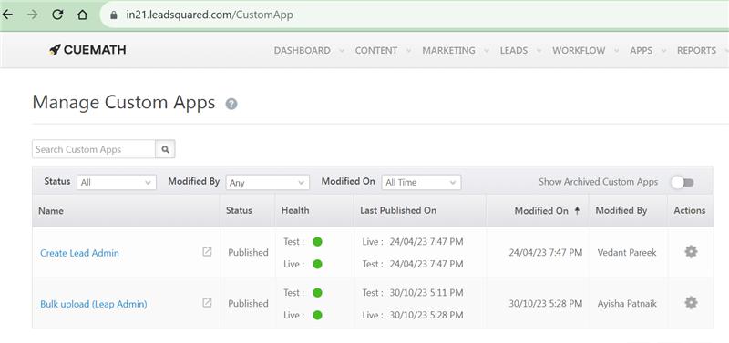 Query: Client can reported that they have published the custom app i.e: bulk upload lead but the same is not visible under the apps.