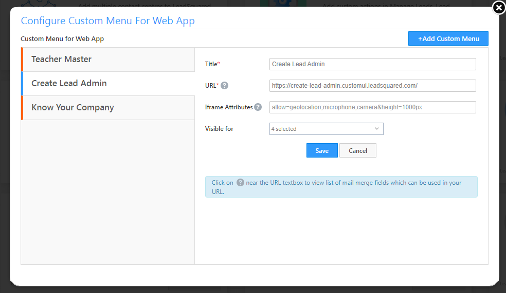 Solution: It can happen that no menu item corresponding to that Custom App (Bulk upload) is added in “Custom Menu For Web App” connector. In such case, we just need to ask them to add the menu item like Create Lead Admin. It’ll start coming under Apps section.