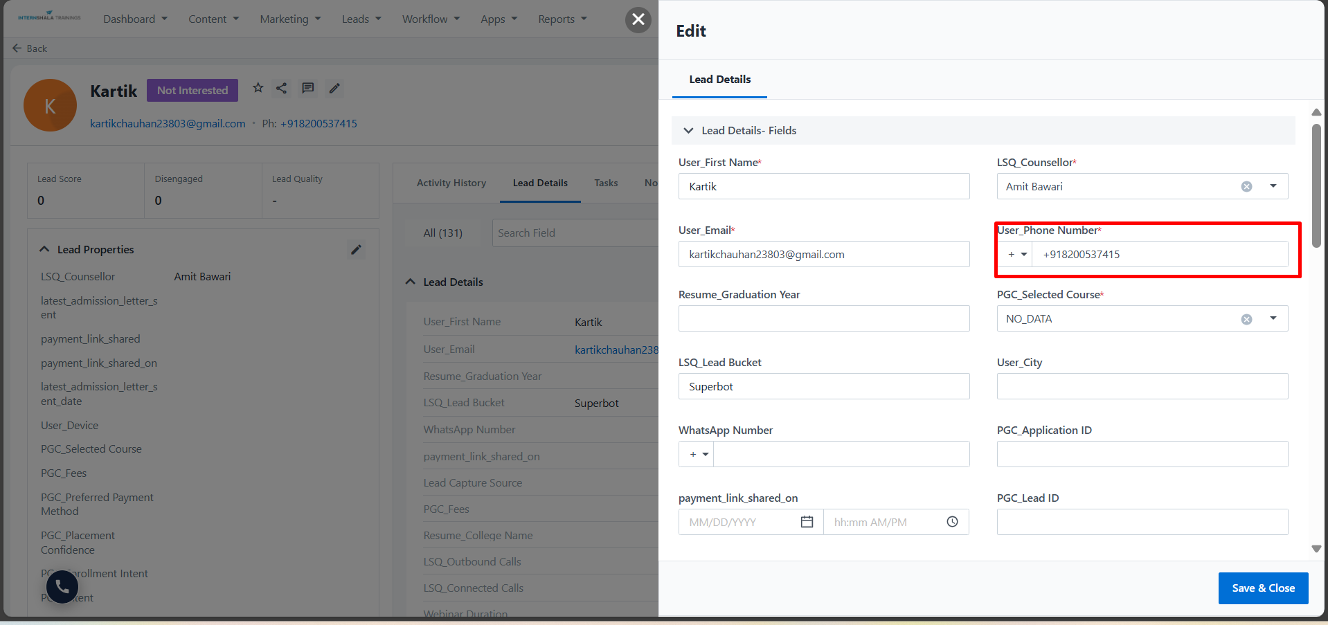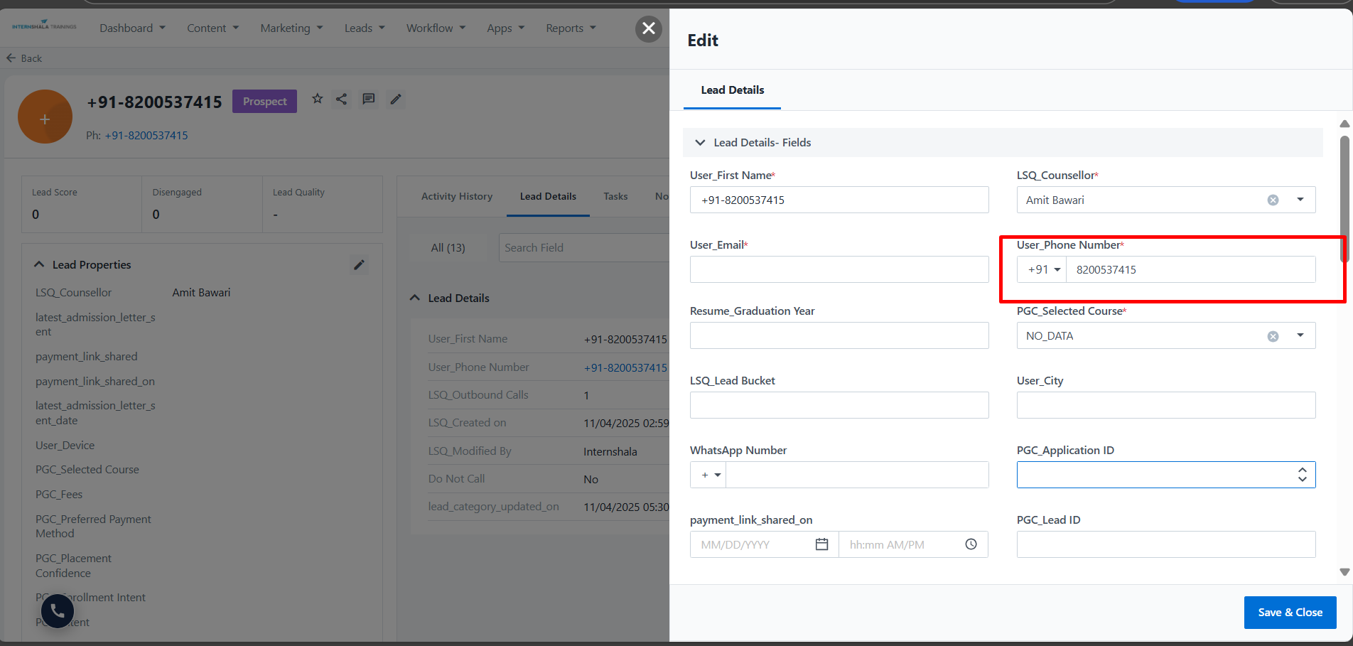 This is a lead created from the API where a hyphen is not added in the phone number after the country code, so the system will consider +91 as a phone number.