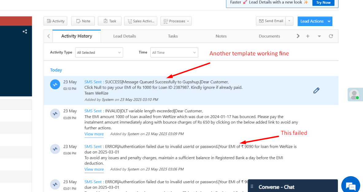 You can encounter an issue where one type of template will be sent properly via SMS and another template in Same account while sending can throw below error i.e “Invalid Credentials“.