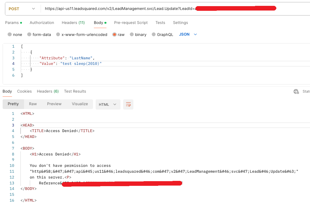 Leadsquared restricts passing SQL payloads,or xss payloads using LSQ APi the reason being that Leadsqured firewall stops those using web firewall before reaching to backend/api.