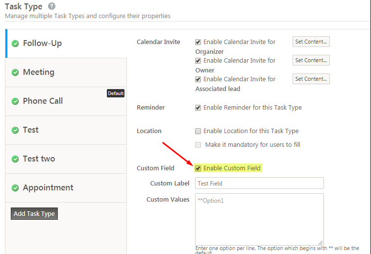 The Custom Field can be added through the UI by enabling the Settings (Check mark “Enable Custom Field“) as shown in the below screenshot.