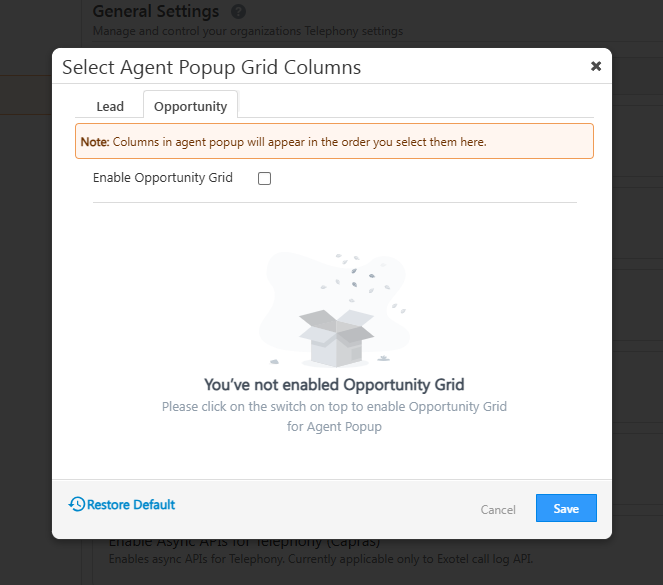 You can reset the ” Configure Agent Popup Grid ” setting and disable opportunity grid.
