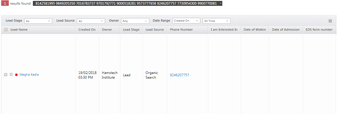 As shown in the search below, only one lead was shown and not the rest 9 while attempting such a search.