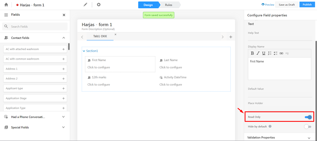 A field can be made read-only in two ways, one via right side properties panel and the other via form rules.