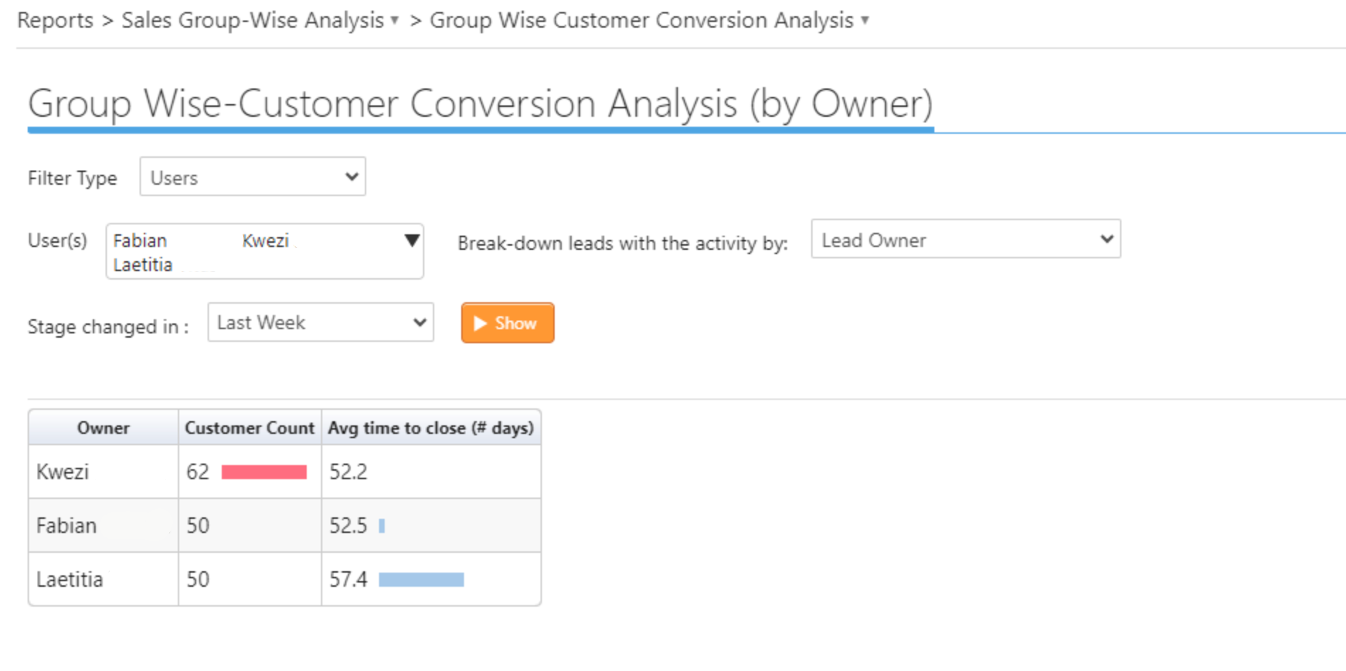You can filter/ segregate the customer counts based on either Sales Group or Owner, which further can be filtered by Lead fields. Stage Change in the filter defines the range in which the lead stage change has happened.