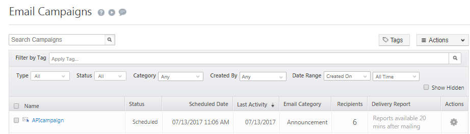 After scheduling the campaign, you can see the campaign details under Marketing– > Email campaigns as shown below: