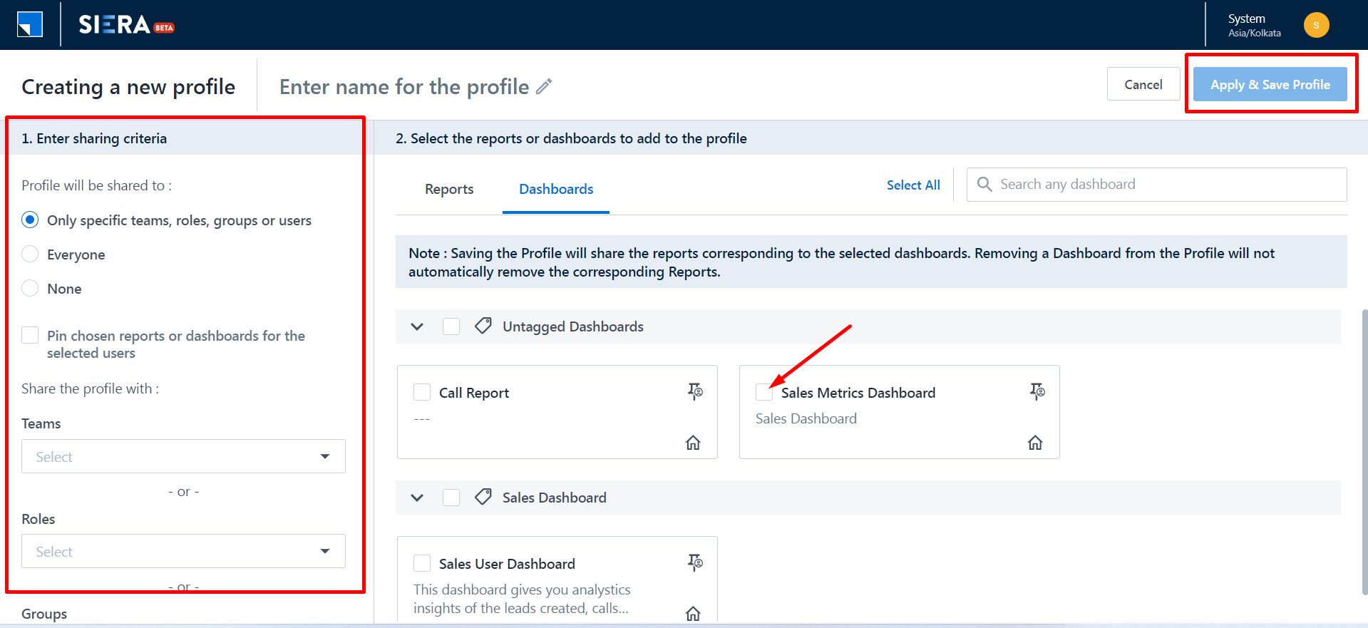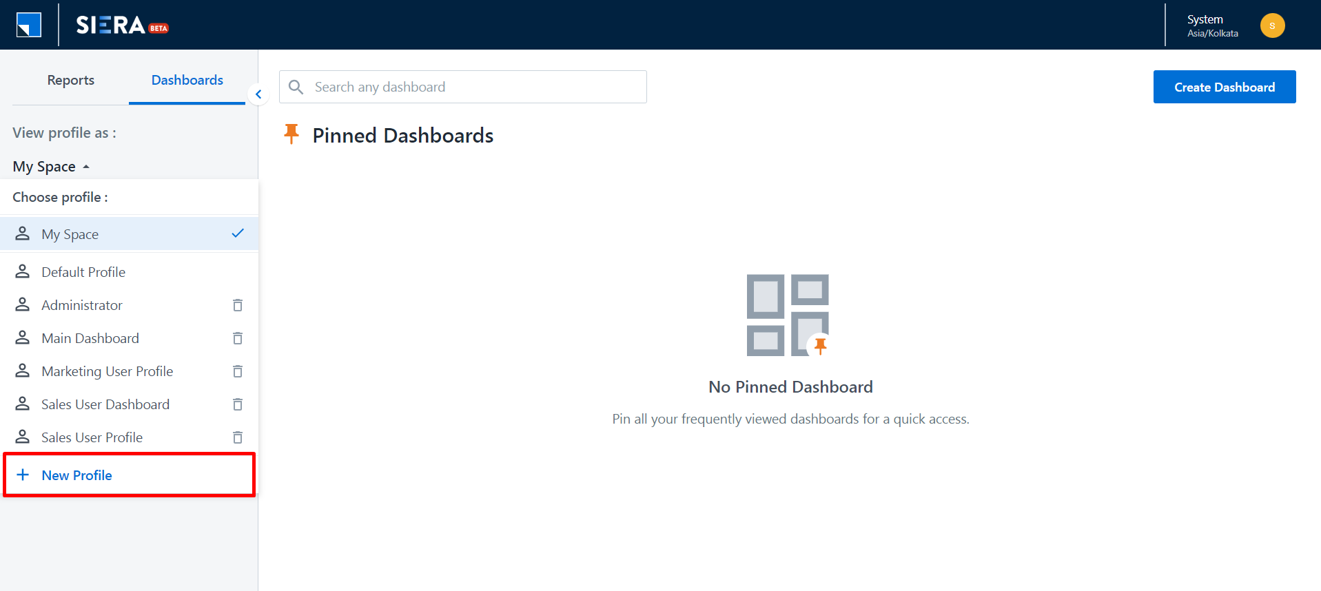 Solution: Kindly note that by default the dashboards created by admin will not be visible to other users from Siera. If the client wants the dashboard to be shared with other users they can go to reports -> siera -> dashboard -> My Space -> create new profile -> give filters accordingly for which Users the dashboard should be visible -> Apply and save.