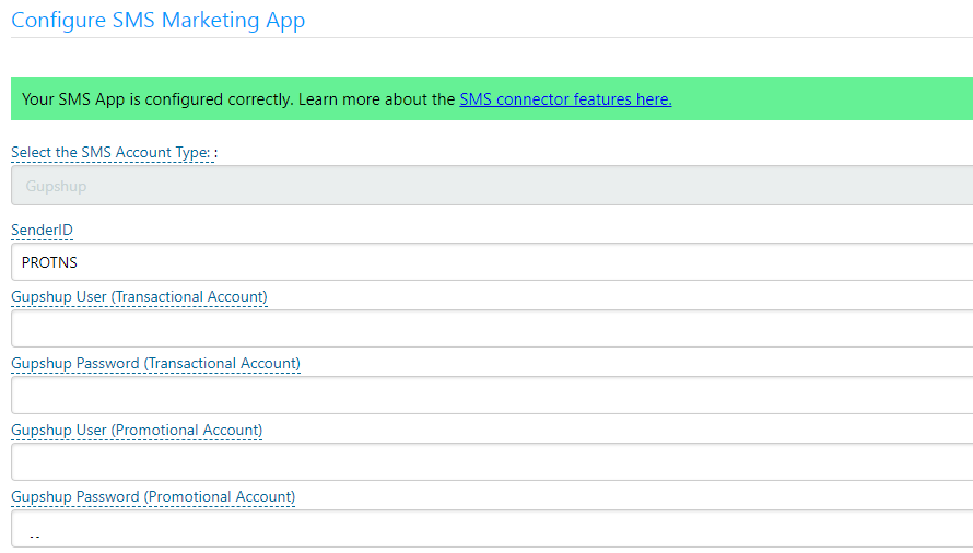 Please encourage customers to use their own account. Our focus henceforth will be to ask customers to “bring their own account”. We will not charge anything in this BYOA mode. As a first step, we now have added Gupshup BYOA in the SMS App. Please note the separate credentials for promotional and transactional. They could be same too, depending on what the customer’s agreement with Gupshup is.