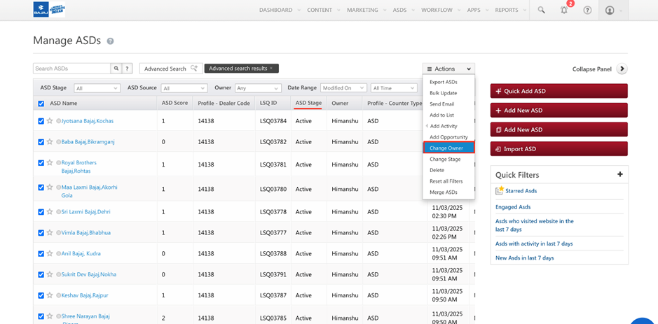 according to ASD name/SAP code as it is Multiple CAM> Select the ASDs >Change the owner.