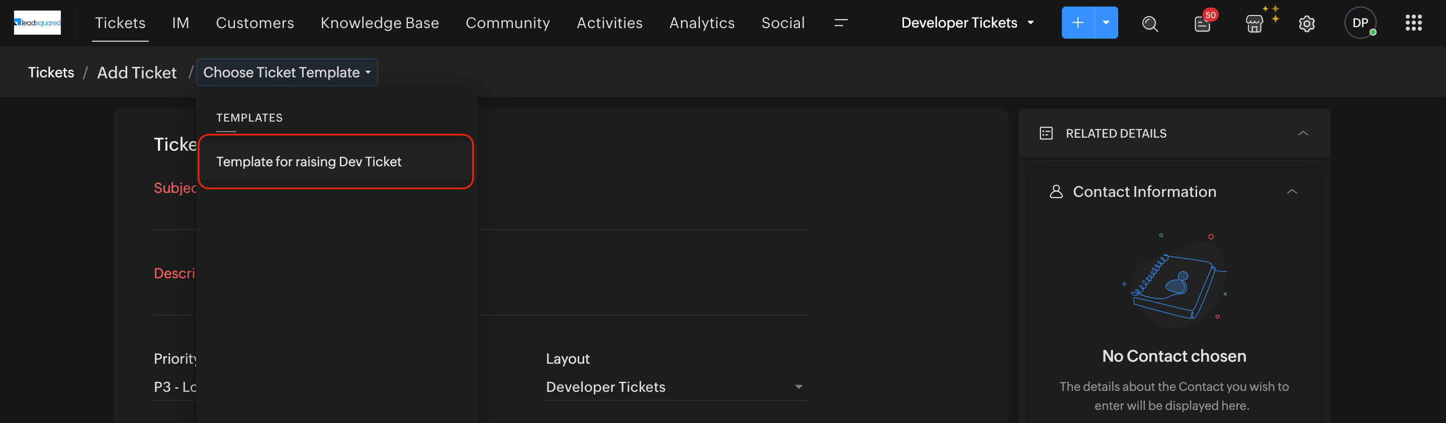 - In the Add Ticket form, click Choose Ticket Template and select a template from the drop-down list.