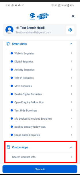 • If the enquiry doesn’t exist in that branch or if it is with any other sales user of that same branch, navigate to the Smart views at the bottom you will find and option in Custom Apps with the name Search contact Info