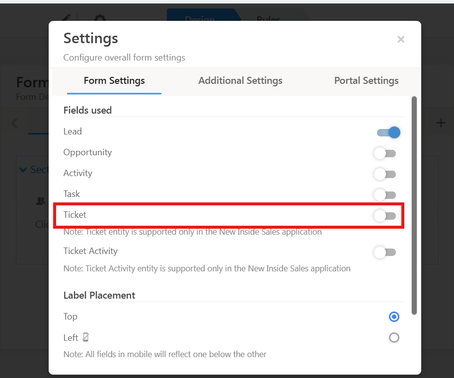 For tenants where Service Cloud is enabled, the Ticket entity must be included while creating the form.